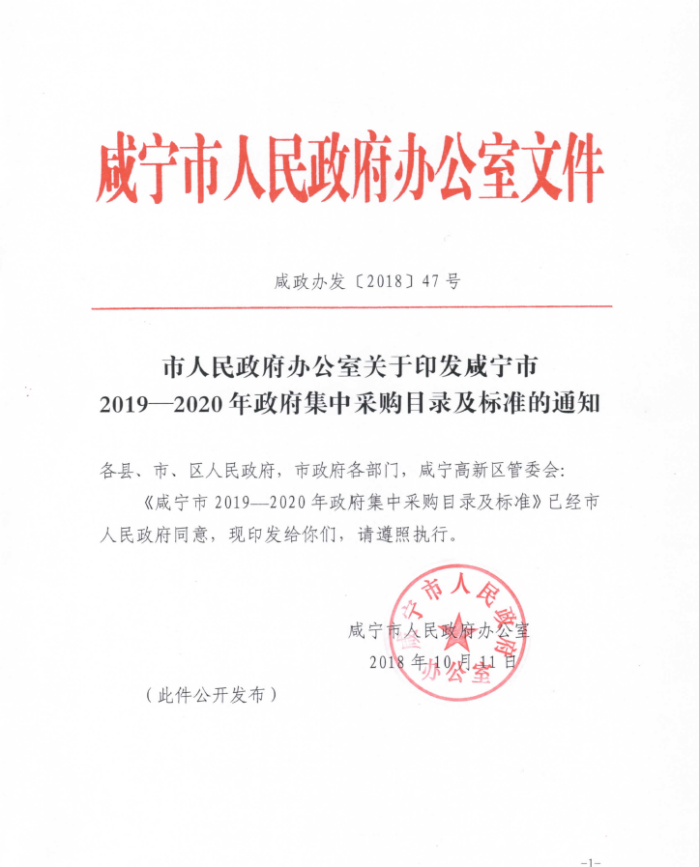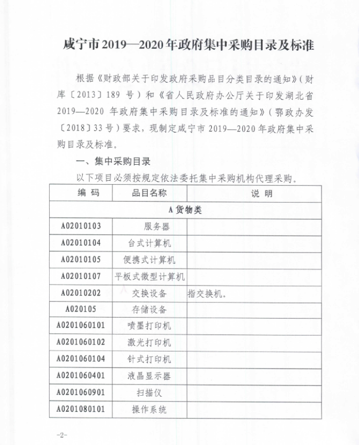 市人民政府办公室关于印发咸宁市2019-2020年政府集中采购目录及标准的通知 咸政办发【2017】48号