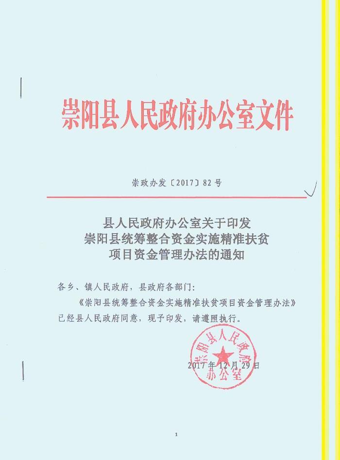 县人民政府办公室关于印发崇阳县统筹整合资金实施精准扶贫项目资金管理办法的通知 崇政办发【2017】82号